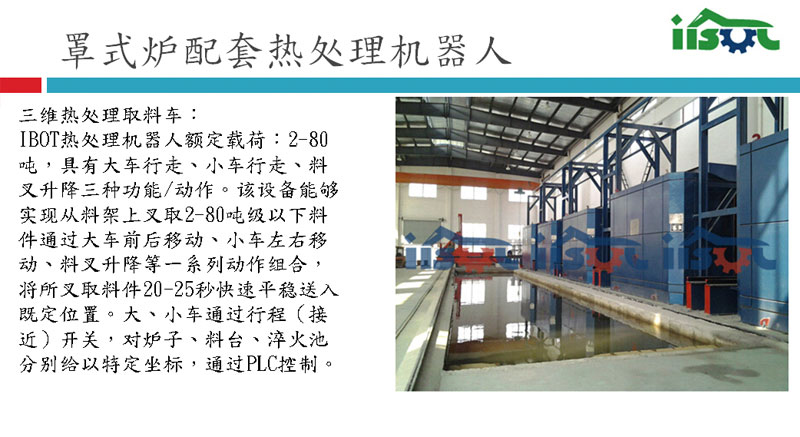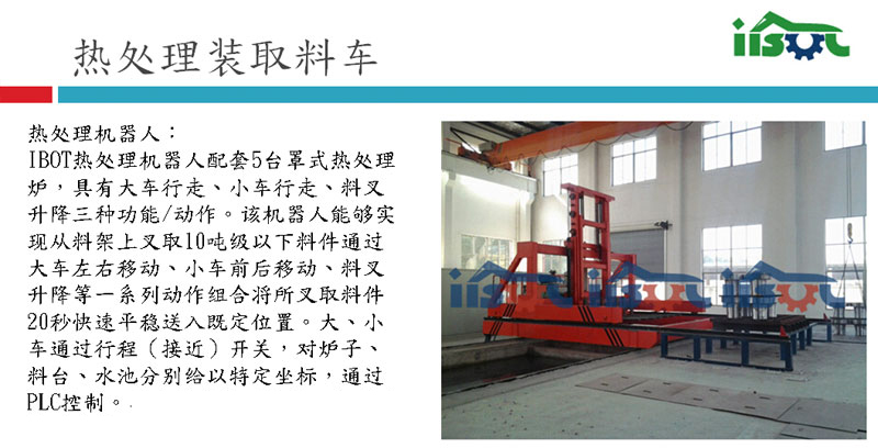 IBOT热处理机器人配套5台罩式热处理炉,具有大车行走、小车行走、料叉升降三种功能/动作。该机器人能够实现从料架上叉取10吨级以下料件通过大车左右移动、小车前后移动、料叉升降等一系列动作组合将所叉取料件20秒快速平稳送入既定位置。大、小车通过行程(接近)开关,对炉子、料台、水池分别给以特定坐标,通过PLC控制。具有自动完成一系列动作的功能。